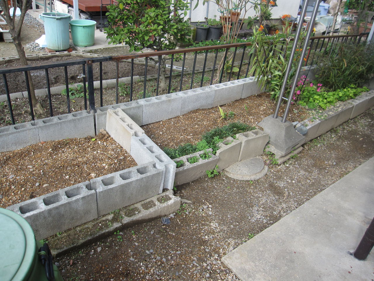 植込み部分は波板と木をすべて取り外し、ブロックを並べ直して野菜や花が植えられるようなスペースを作り、