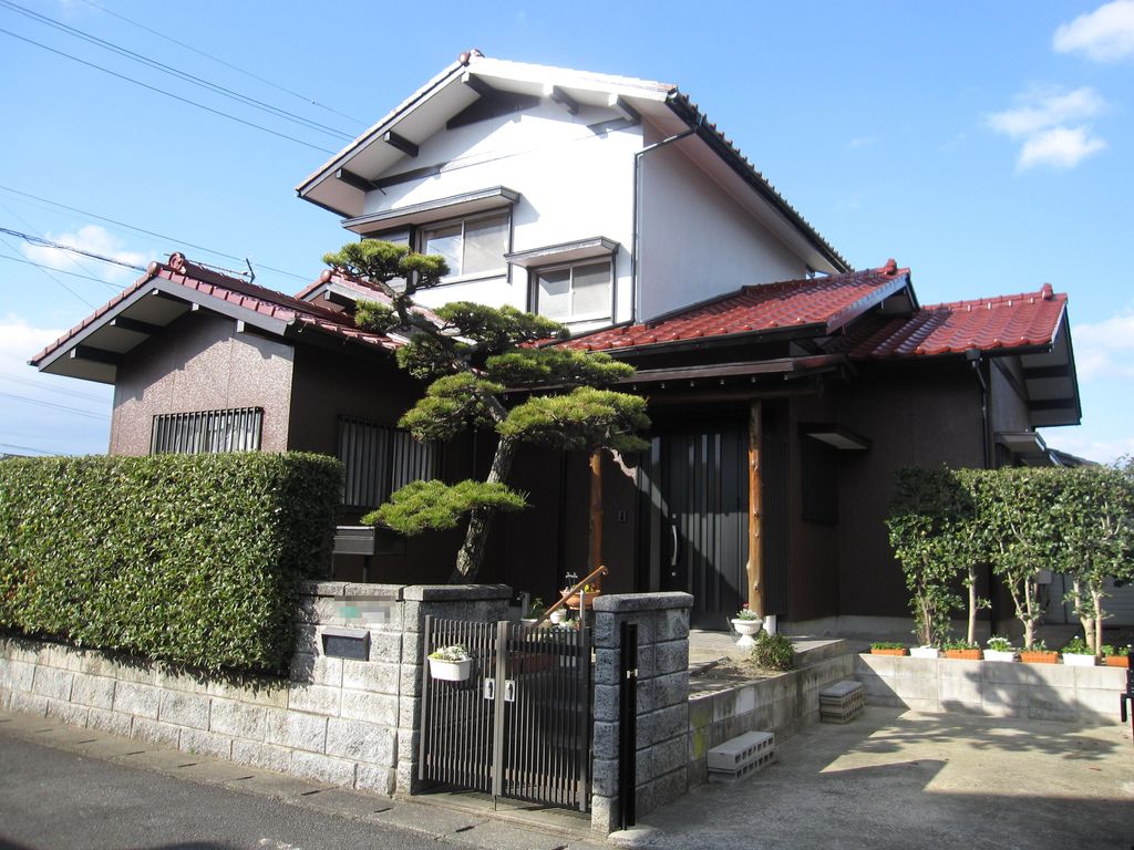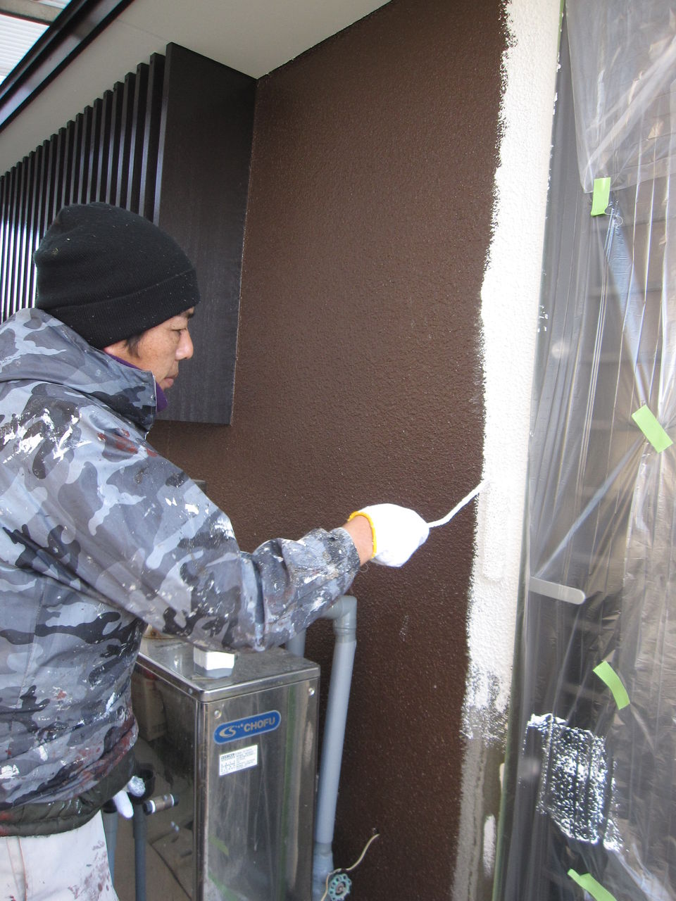 外壁はグレーホワイトと茶のツートン、戸袋や窓枠などをチョコレート